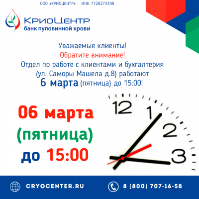 06.03.2025 Уважаемые клиенты! Обратите внимание! СЕГОДНЯ отдел по работе с клиентами и бухгалтерия (ул. Саморы Машела д.8) работают до 15:00!
