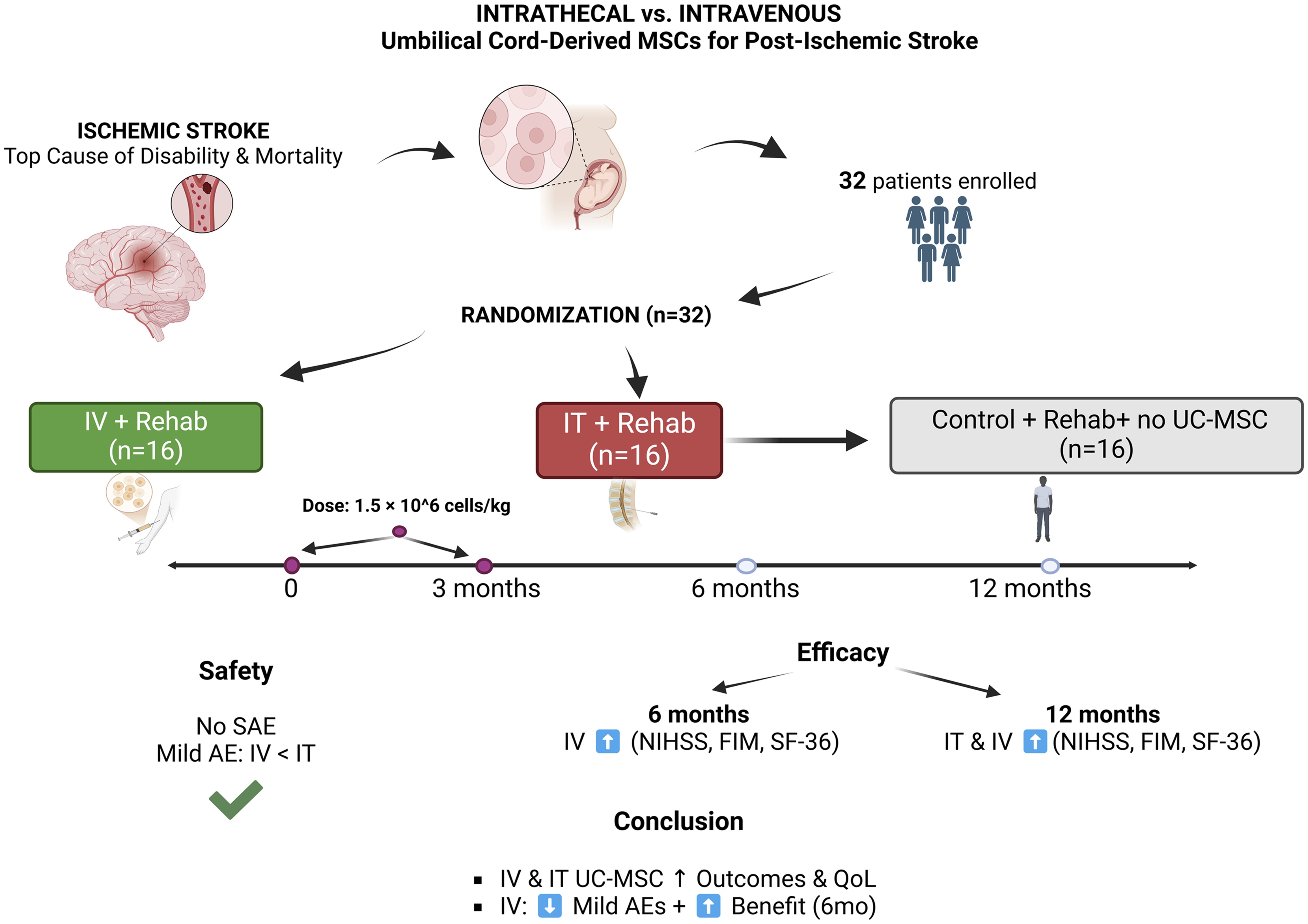 Именно в этом контексте было проведено рандомизированное контролируемое исследование 2-й фазы, в котором сравнивались два различных метода введения. В исследовании приняли участие 32 пациента в возрасте от 40 до 75 лет, которые находились в подострой или хронической фазе восстановления (от 7 дней до 24 месяцев после инсульта). Прежде всего, оно продемонстрировало, что лечение МСК пуповины, безопасно, при этом у пациентов отмечается улучшение неврологического дефицита, качества жизни и функциональной независимости по сравнению с контрольной группой, получавшей только реабилитацию.
